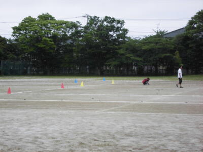 ( ↓ 早朝から先生たちで校庭の整備をおこないました。ラインを引いてコーンを並べてコースを作ったり、石拾いや除草をしたりしました。)