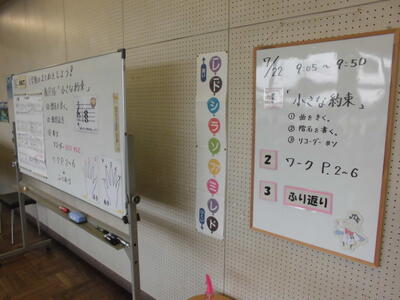 ( ↓ 本時の学習内容や、今日のめあてホワイトボードに示され、目的をもって学習にのぞめるようになっています。)