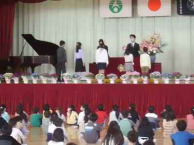↓ 式の後、後期の代表委員に、校長先生から「ひまわり賞」が渡されました。