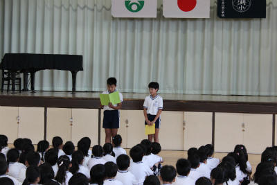 今日の児童朝会は、プール開き集会でした。今日の集会は、運動委員が中心となって運営してくれました。
