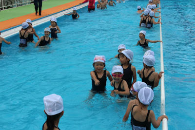 まだちょっと涼しい感じもありましたが、気温・水温も何とか規定に達し、実施することができました。1年生も初めてのプールでの授業です。にぎやかな声が響いていました。