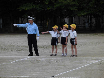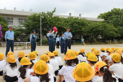 小渕小の子どもたちのために、春日部警察署、交通指導員、交通安全協会、市役所と、各所から御来校いただき、交通ルールや安全な行動の仕方について御指導いただきました。