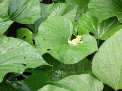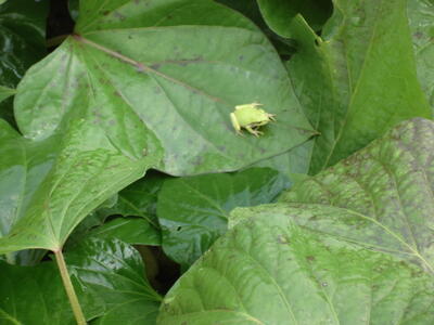( ↑ 暑い中の水に喜んで、あちこちからたくさんのカエルが姿を見せています。)