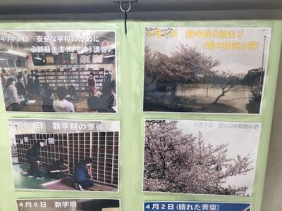 ( ↓ 学校の掲示物。職員室前の廊下には、今年度の学校の歩みが、写真で示されています。来校の際には、ご覧になって下さい。)