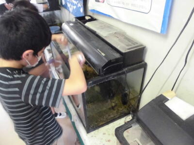 ( ↓ 木曜日の放課後。ホタルの幼虫を育てるために、校長先生が近所の用水路でタニシをとってきました。先週、5年生の先生もとってきたので、その分とも合わせて、けっこうな数となりました。夏にきれいに舞うホタルも、この時期にタニシを育てるところから始まります。)