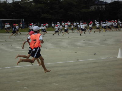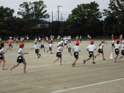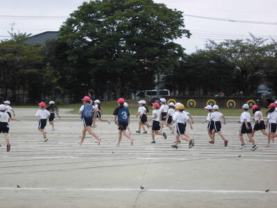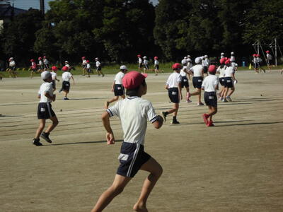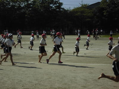 本日の朝は全校運動の時間「さわやかタイム」です。自分自身の体力向上や運動会を目標に、子供たちは元気に校庭を走っています。
