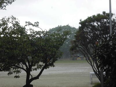 ( ↑ 校庭には水たまりが出来ていますが、空は晴れ、樹上ではセミが鳴いています。)