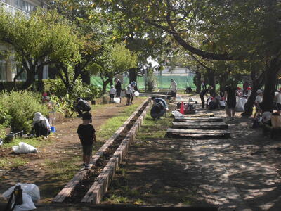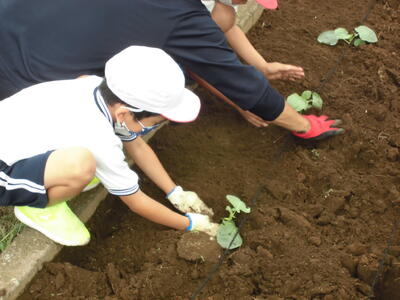 先週の親子除草の際には、花壇ボランティアの方にもご協力いただき、サツマイモ畑の世話をおこなっていただきました。