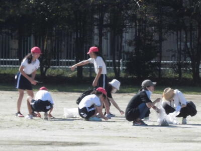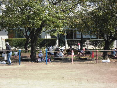 子供たちは、教室に戻ってお弁当となります。校庭では、保護者のみなさんにご協力いただいて、片付けかが始まりました。