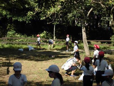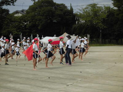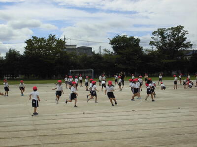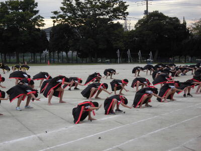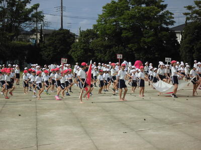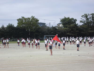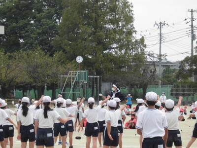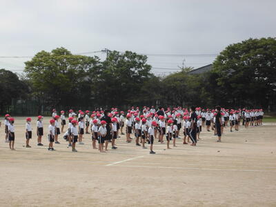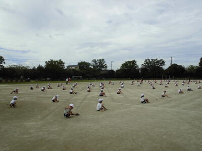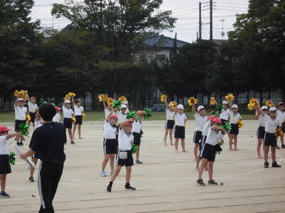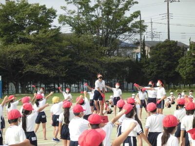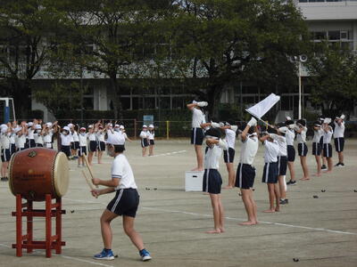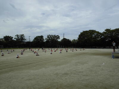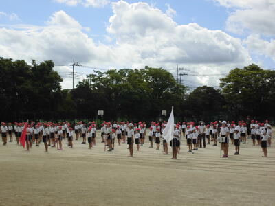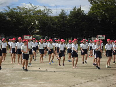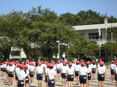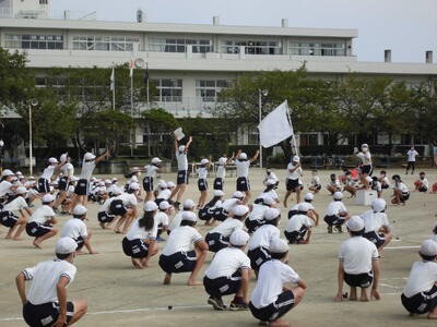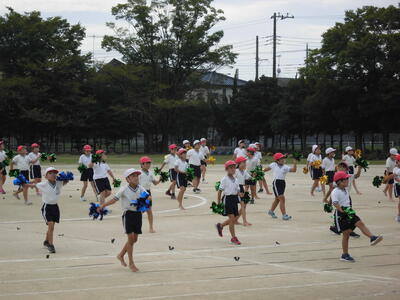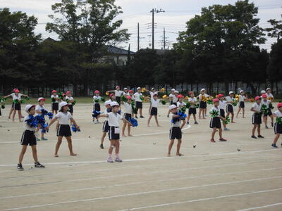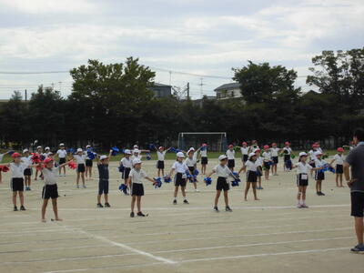 朝は、全体で応援合戦の練習をおこないました。密を避けるために、となりとの間隔をじゅうぶんにあけたり、マスクをしたまま声を出したりと、例年とは違う形での取組ですが、子供たちは精一杯に練習に励んでいます。