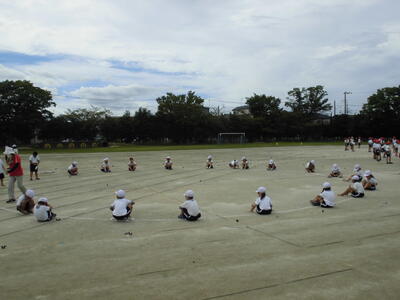 ( ↓ 低学年ブロック、1・2年生の練習。ダンスの時の隊形などを確認しています。)