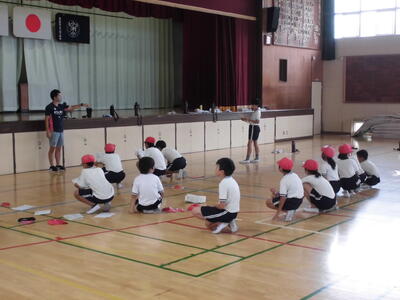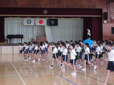 ( ↓ 3・4年生の練習の時は雨が降ってきたので、体育館で練習をおこないました。体育館いっぱいに子供たちの声と笑顔が広がりました。)