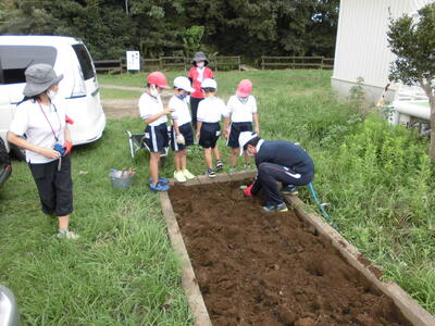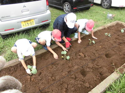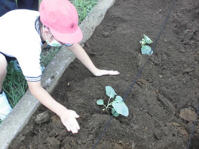 今日は学校の農園に、たんぽぽ・ひまわり学級の子供他たちが、ブロッコリーの苗を植えました。校長先生に教わりながら、ていねいに苗を置いたり、土をかぶせたりしていきました。最後に、自分たちが苗を植えた畑を眺めて、ブロッコリーが元気に育ってくれることを願って、教室に戻りました。