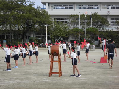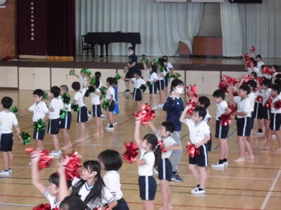 運動会に向けて、今朝の全体練習では、応援合戦を通しておこなってみました。