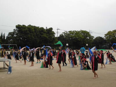 ( ↓ 先週の運動会練習の様子。高学年が、衣装をつけてスカーフを持ちながら、ダンス・ソーラン節の練習をしているところです。)