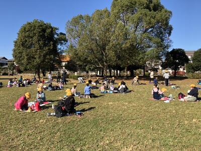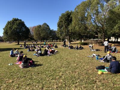 晴れた空のもと、公園でお弁当です。密を避けるため、一人一枚のシートを敷いて間隔を保って食べています。