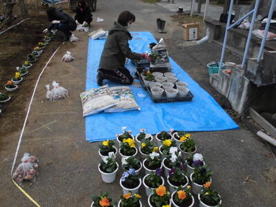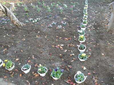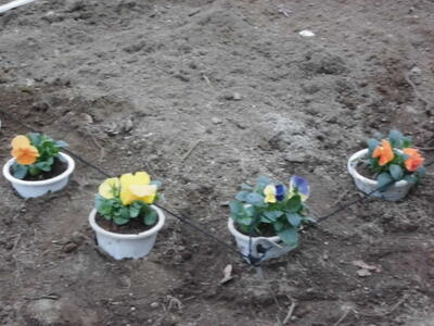 ↓ 植木鉢に花を入れ、花壇の周りを囲むように植えました。