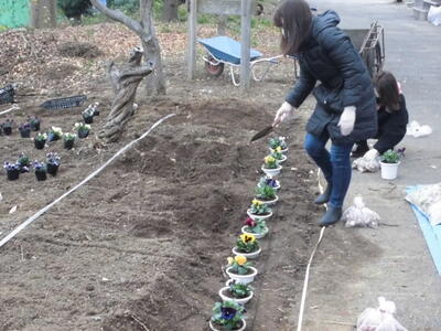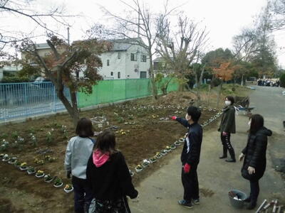 ただの草地が、きれいな花壇に変わりました。春には満開の花々が、新入生たちを迎えてくれることになります。