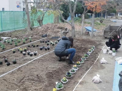 ↓ 校長先生や校務員さんが除草し木の根を掘り起こした草地に、土を入れ、球根や花を植えました。