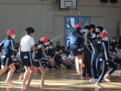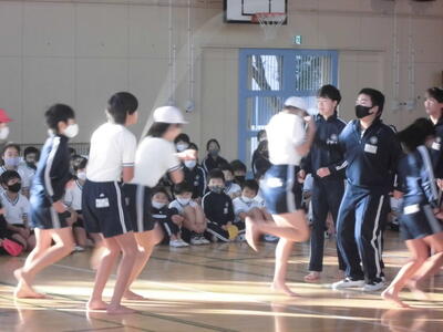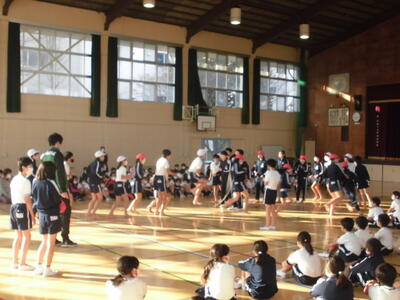 ↓ 埼玉県の縄跳び大会で1位になった6年生が、長縄跳びを披露しました。