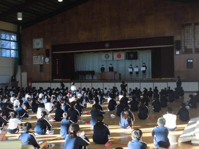 本日の朝は表彰朝会です。体育館で密を避けるため児童間の間隔をあけ、換気をしながらおこないました。