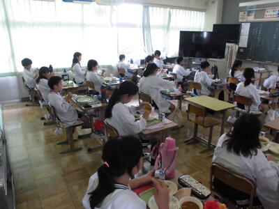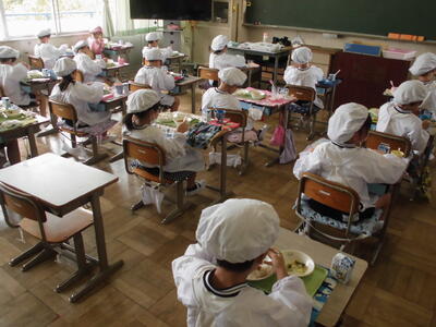 ( ↓ 食べ始めました。感染症対策のため、班を作らずに前を向いて、話をしないで食べます。)