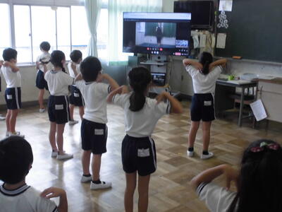 ( ↓ 運動委員さんを中心に、健康観察や準備体操をおこないます。)