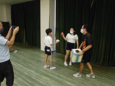( 音楽が止まった時にボールを持っていた人はペナルティです。でも、ボールを持っていた人とは限らず、「となりの人」「右の五人」「持っていなかった人」など、そのつど変わります。)