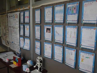 今日は日曜日で学校はお休みです。学校の各教室の廊下には、子供たちの夏休みの作品が飾られています。