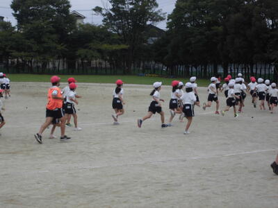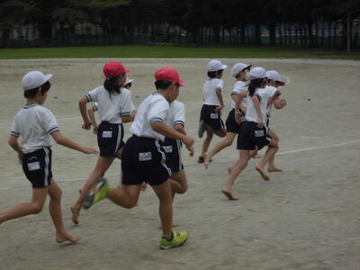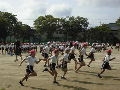 今日の朝は、二学期最初の体育朝会です。子供たちは、8秒間走に取り組みました。