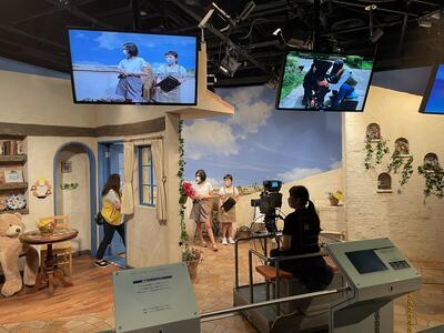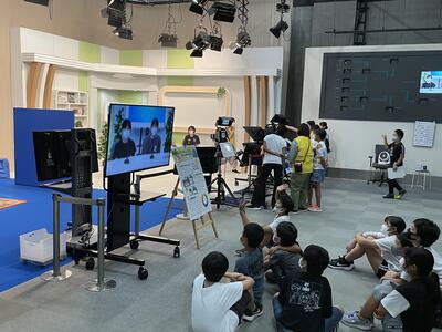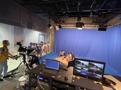 (スタジオ収録体験です。キャスターやカメラマン、フロアディレクターなどの役割に分かれて、ニュース番組を作ってみます。)