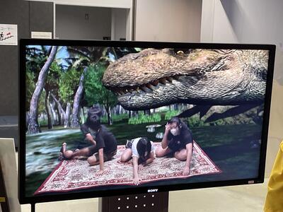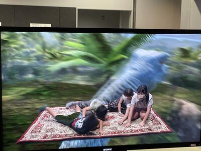 (合成映像で、じゅうたんで空を飛んでいる体験をしてみます。)
