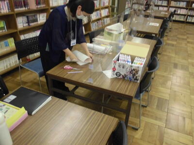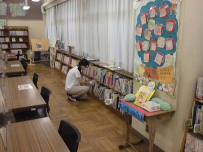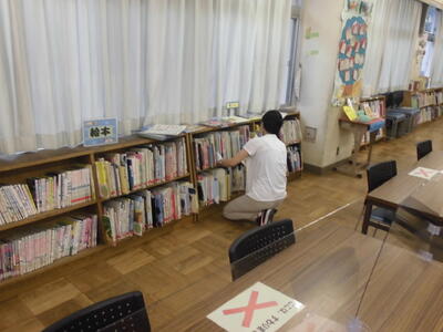 ( ↓ 図書館支援員さんが図書室の整備を進めてくれています。)