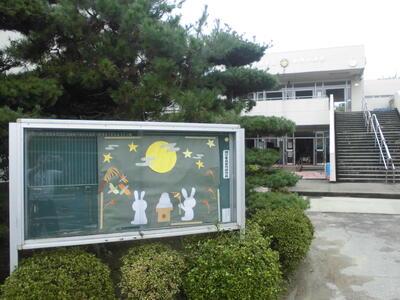 学校の正門の掲示版も、9月になって、秋らしいイメージのデザインに変わりました。