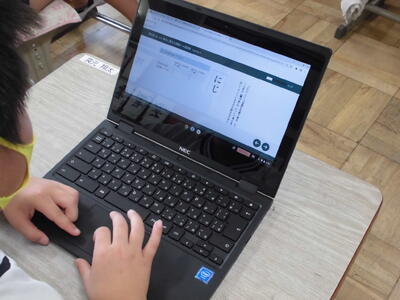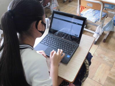 ( ↓ 4年生の総合的な学習の時間です。福祉の学習で、自分たちで調べた手話の指の動きを、タブレットで撮影して画像を先生のタブレットに送っています。)