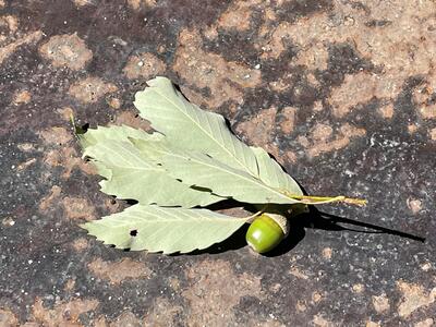 ( ↓ 落ちたばかりのドングリ。葉っぱと帽子つきです。)