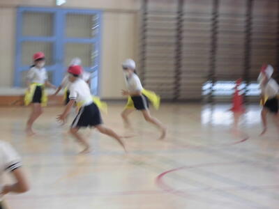 ( ↓ 4年生の体育です。リレーのバトンパスの練習をしています。声にあわせてバトンを受け取ります。)