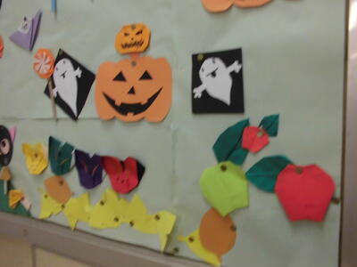 ( ↓ 2階のたんぽぽ・ひまわり学級の教室の前の掲示版。ハロウィンをイメージした掲示ができています。)