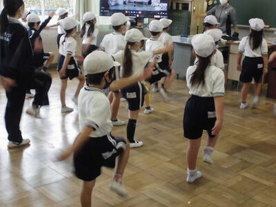 ( 金管バンドの音楽に合わせて、教室の児童も入場行進のように足踏みしてみます。)