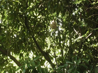 ( 樹上から、バレーボールほどの大きさの巣がぶらさがっています。ハチも出入りしています。)