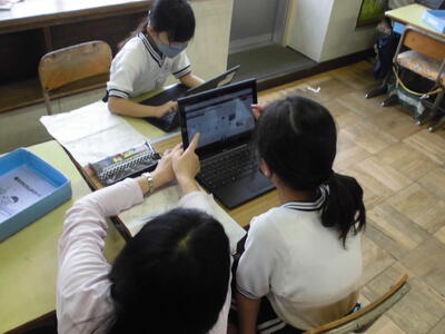 ( ↓ タブレット活用して、自分の考えをまとめています。)