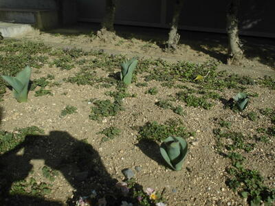 学校のあちこちでチューリップの球根が育ってきています。きれいな花が咲くのが楽しみです。