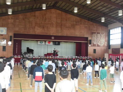 ( ↓ 校歌の合唱です。きれいな歌声が体育館に響いています。)