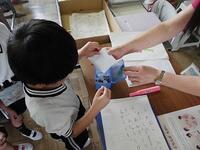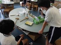 理科室から何やら机をたたく音が聞こえてきました。行ってみると、6年生が「たたき染め」の実験をしていました。シロツメクサをろ紙に挟んで木槌でトントン、トントン。たたいて、たたいてろ紙にしみこませます。その後薬品処理をして、ヨウ素液に浸しました。ヨウ素液といえば、ご存じの方も多いと思いますが、デンプンに反応して青紫色に変色する液体です。葉が光合成をしてデンプンが生成されていることを確かめる実験でした。結果は多くの班がうまくいったようです。トマト同様、夏の日差しを浴び、たくさん光合成していました。