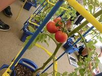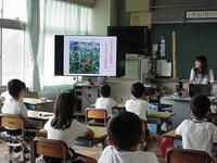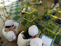 今日は2年生がミニトマトの観察をしていました。葉の色や形、実のつき方などじっくり見て絵と文で記録していました。苗を植えたときは高さ10cmほどでしたが、今はすでに70~80cm、実をつけているものもたくさんありました。緑の実が多かったようですが、暑い日差しを浴び、ぐんぐん成長しています。真っ赤なトマトになる日も近いです。実は熟したものから持ち帰ります。2年生の児童が持ち帰りましたらご家族で味わってください。なお、夏休み中はご家庭で栽培を続けてください。7月13日~18日の間に取りに来ていただけると幸いです。ちなみに、ミニトマトは脇芽をつむとおいしい実がなるそうです。