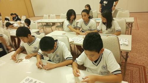 夕食後は箱根の伝統工芸品である、寄せ木細工作りです。みんな真剣にオリジナルコースターを作りました。