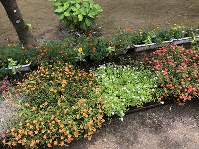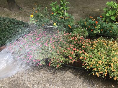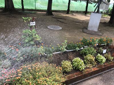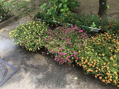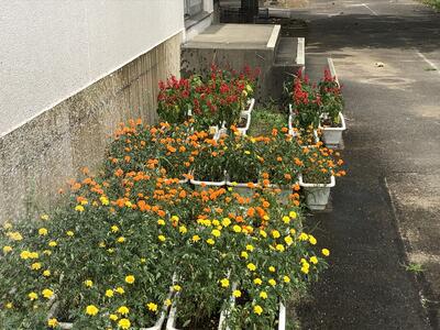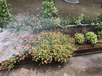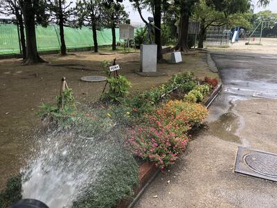 夏休み中の学校では、土日や学校閉庁日も、先生方が順に学校に来て、花に水やりをおこなっています。