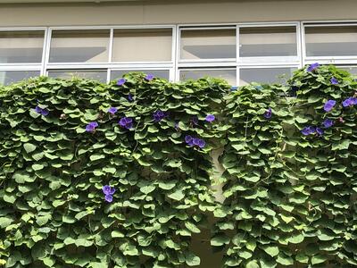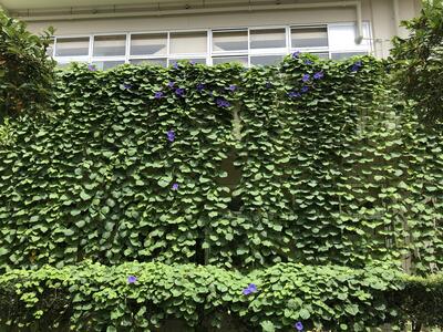 学校のグリーンカーテンのリュウキュウアサガオが元気に育っています。