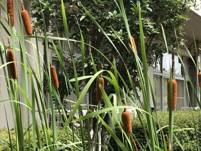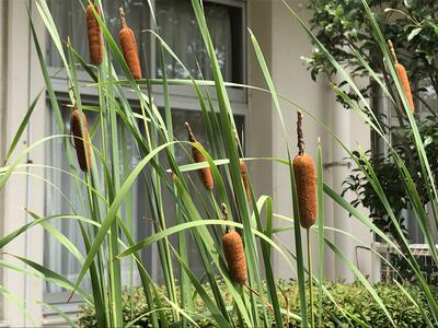 学校の観察池の水辺には、ガマの穂が育っています。