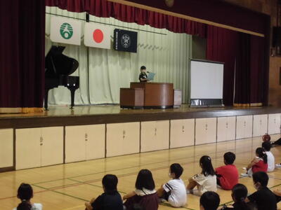 ( ↓ 全校児童を代表して4年生が、二学期の目標を発表しました。)